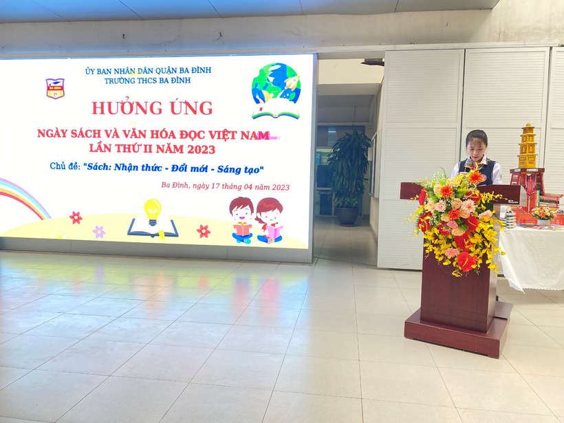 Để lan tỏa ý nghĩa của việc đọc sách, em Nguyễn Ngọc Khánh - Học sinh lớp 7A5 đại diện học sinh toàn trường lên hưởng ứng Ngày sách và văn hóa đọc Việt Nam.