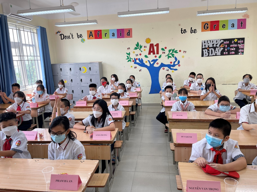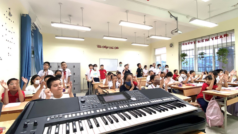 Các em học sinh trong tiết âm nhạc đầy hứng khởi