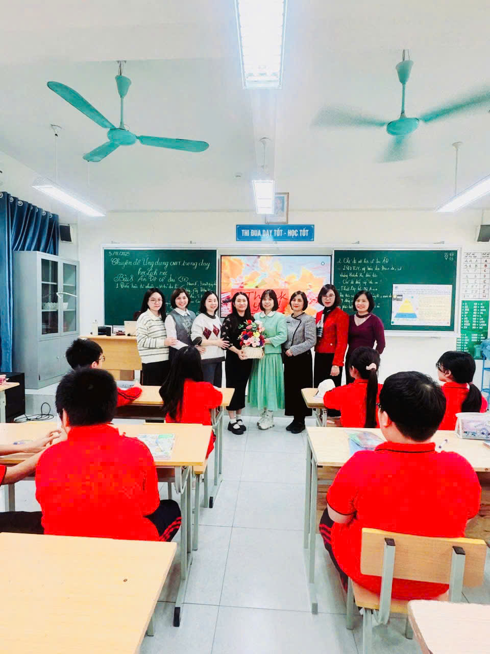Kết thúc tiết chuyên đề, đồng chí Tổ trưởng tổ Xã hội cùng các giáo viên trong tổ đã tặng hoa chúc mừng và gửi lời cảm ơn đến cô giáo Cao Phương Thảo vì sự chuẩn bị chu đáo, tinh thần sáng tạo và nỗ lực đổi mới trong giảng dạy.
