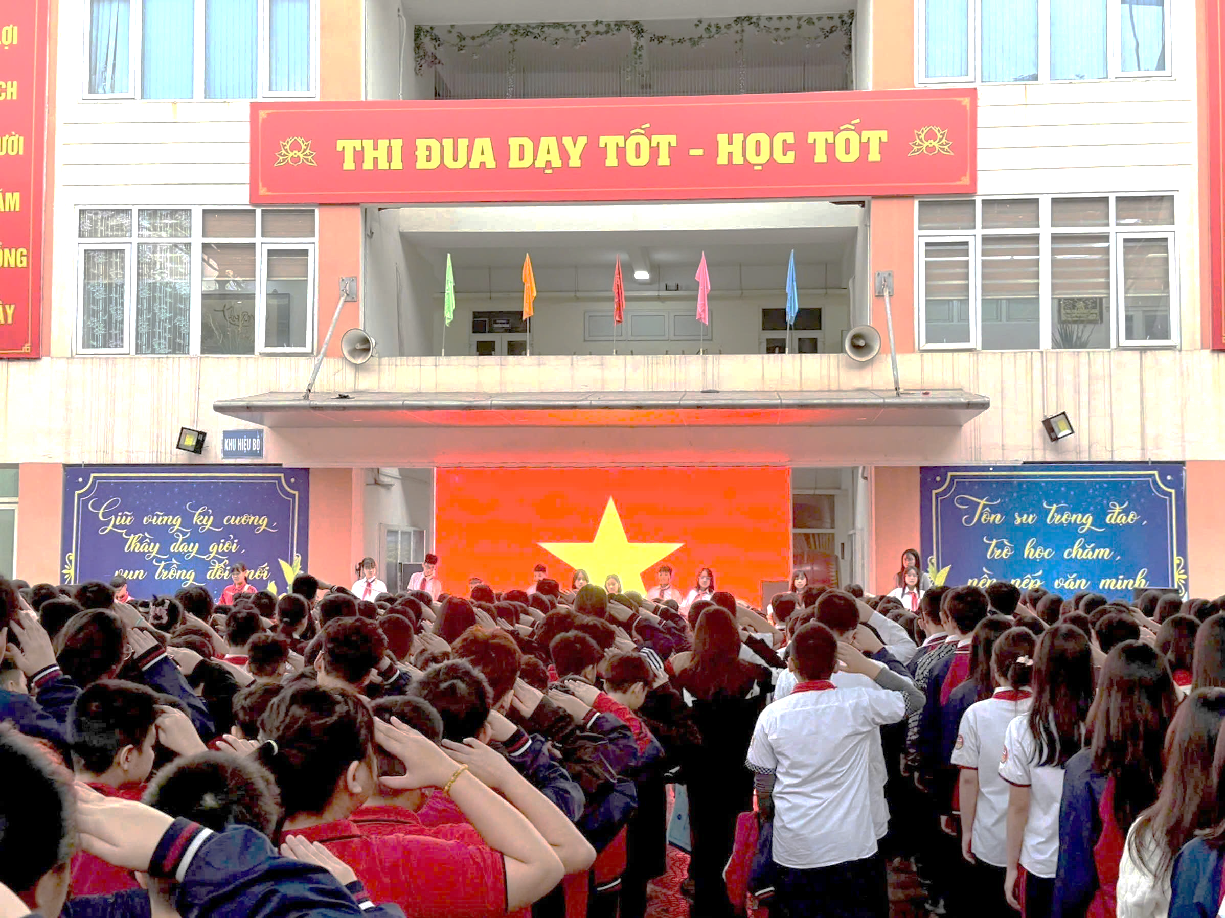 Sáng đầu tuần, sân trường ngập tràn sắc xuân. Trong tiếng Quốc ca vang lên trang nghiêm, toàn thể cán bộ, giáo viên và học sinh nhà trường thực hiện nghi thức chào cờ với niềm tự hào và tinh thần trách nhiệm. Lá cờ đỏ sao vàng tung bay trong nắng sớm như nhắc nhở mỗi thành viên về ý chí phấn đấu, lòng biết ơn và khát vọng vươn lên trong năm mới.