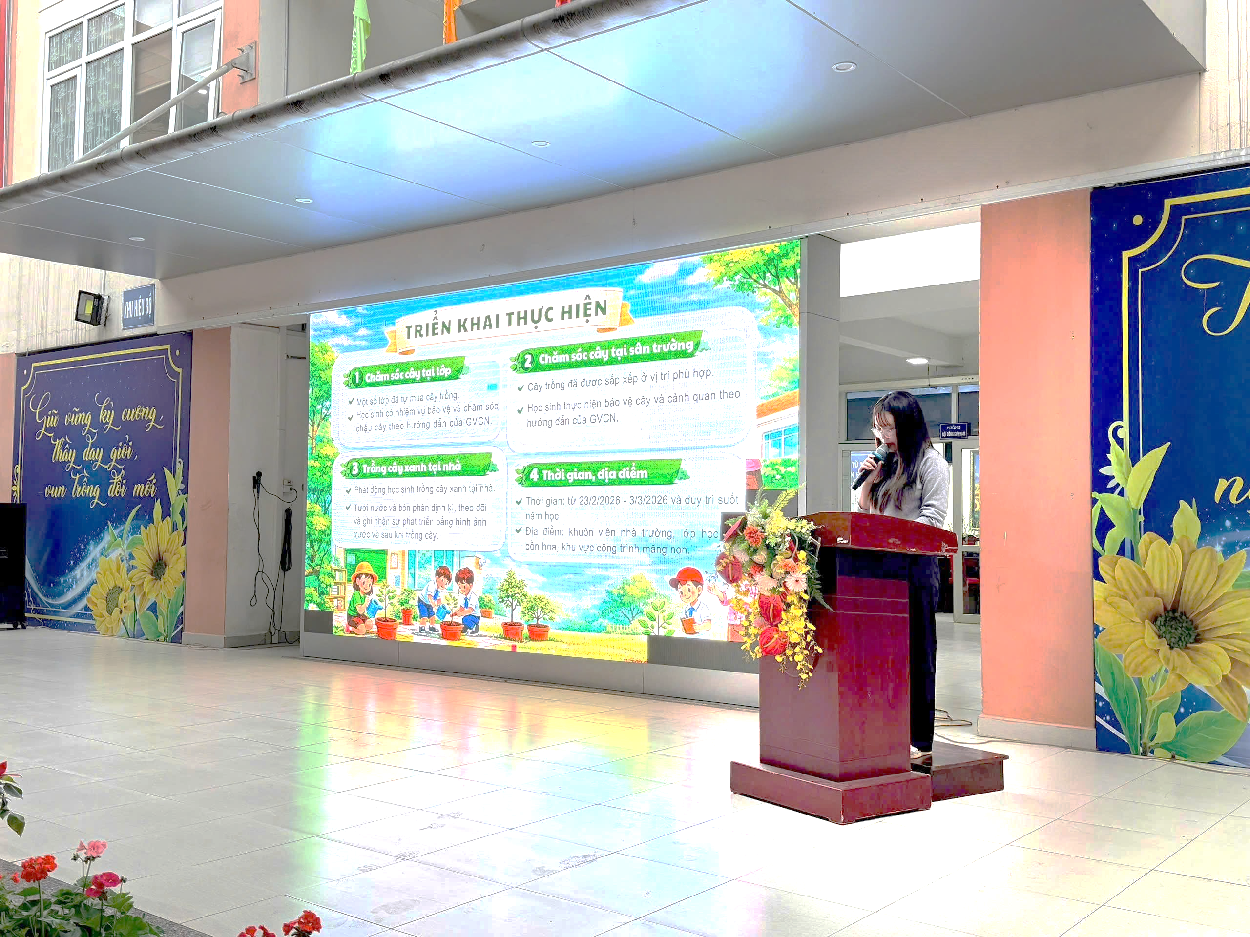 Cũng trong chương trình, nhà trường đã phát động phong trào “Tết trồng cây Xuân Bính Ngọ 2026”. Hoạt động không chỉ góp phần xây dựng môi trường học đường xanh - sạch - đẹp mà còn là dịp để thầy và trò hưởng ứng truyền thống tốt đẹp do Chủ tịch Hồ Chí Minh khởi xướng - phong trào “Tết trồng cây” đầy ý nghĩa mỗi dịp đầu xuân. Qua đó, nhà trường mong muốn giáo dục học sinh ý thức bảo vệ môi trường, trân trọng thiên nhiên và hiểu sâu sắc hơn về trách nhiệm của thế hệ trẻ trong việc giữ gìn, phát triển màu xanh cho hôm nay và mai sau. Các lớp tích cực hưởng ứng bằng việc chăm sóc, bảo vệ cây xanh trong khuôn viên trường, góp phần tạo nên không gian học tập trong lành, thân thiện.