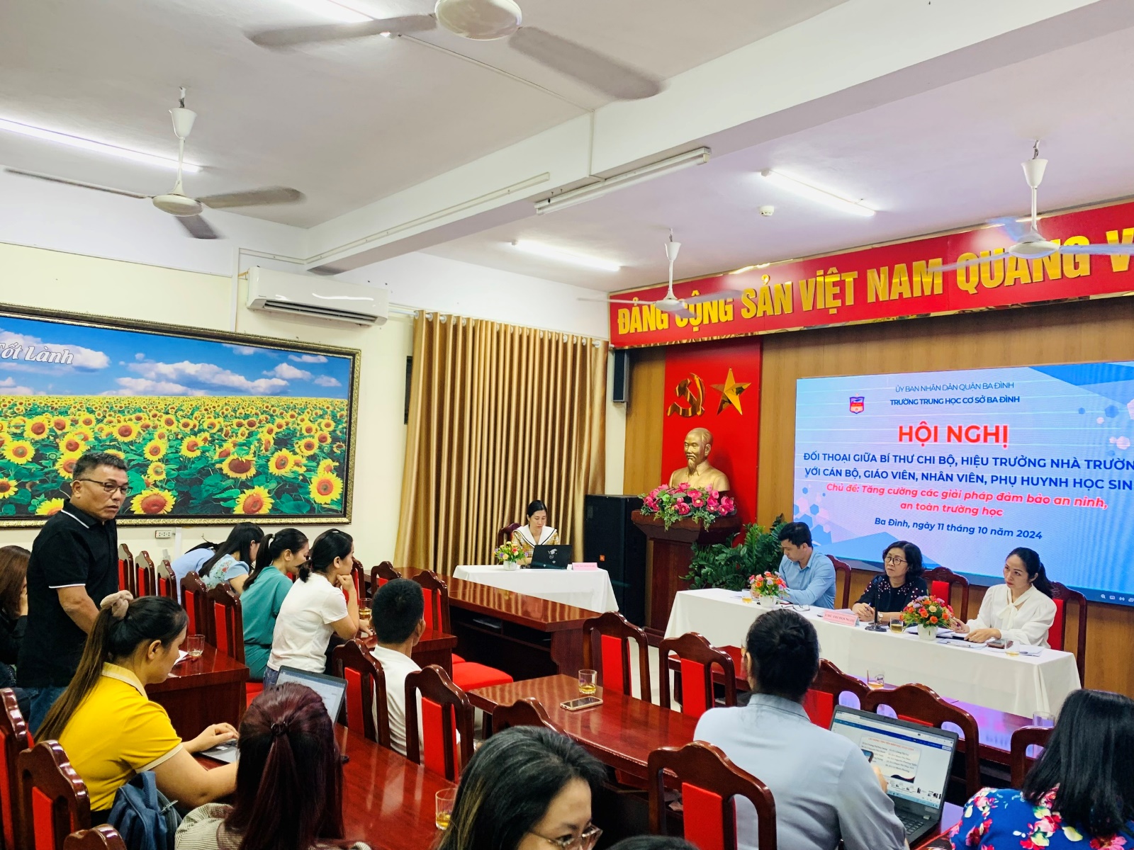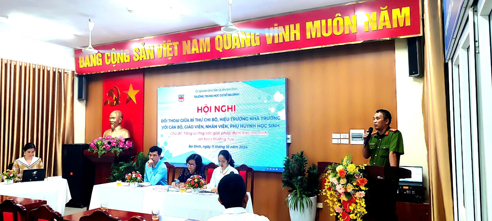 Thực hiện kế hoạch số 35/KH-THCS BĐ, dưới sự chỉ đạo của Phòng GDĐT quận Ba Đình, chiều ngày 11/10/2024 tại phòng Hội đồng sư phạm, trường THCS Ba Đình đã tổ chức thành công hội nghị đối thoại giữa Bí thư chi bộ, Hiệu trưởng nhà trường với cán bộ, giáo viên, nhân viên, phụ huynh học sinh với chủ đề “Tăng cường các giải pháp đảm bảo an ninh, an toàn trường học”.