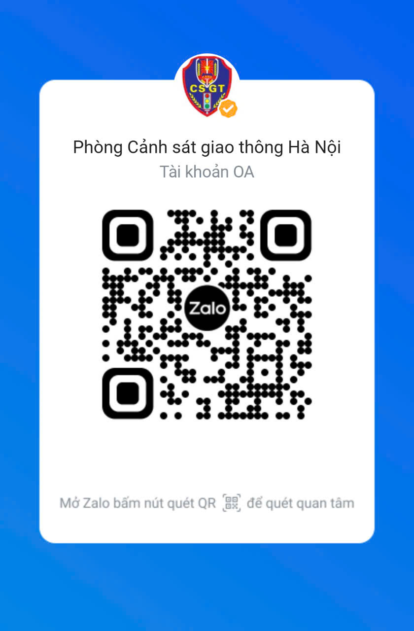 Để truy cập Trang Zalo OA "Phòng Cảnh sát giao thông Hà Nội" cung cấp các thông tin phản ánh các hành vi vi phạm về trật tự ATGT trên địa bàn Thành phố; đồng thời để cập nhật, theo dõi thông tin về tình hình, kết quả công tác bảo đảm trật tự ATGT trên địa bàn Thủ đô, các thầy cô, quý phụ huynh học sinh và học sinh có thể quét Qr Code và nhấn "Quan tâm" để truy cập vào trang thông tin của Phòng Cảnh sát giao thông Thành phố Hà Nội.