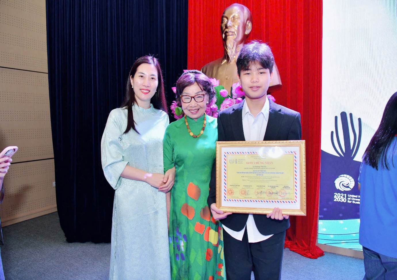 Cô Quỳnh Duyên cùng học sinh trường Ba Đình nhận giải thưởng