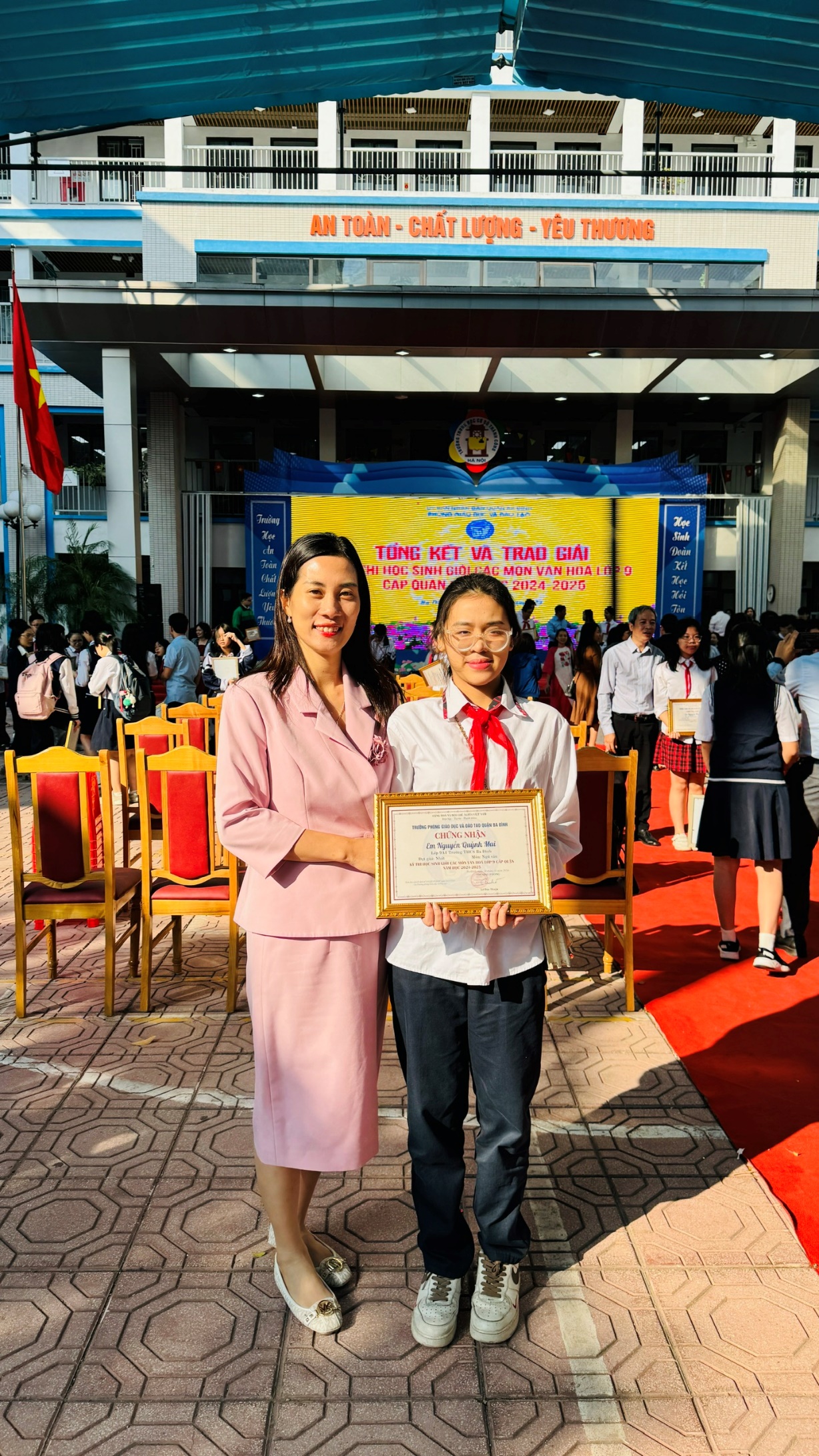 Cô giáo Phạm Thị Quỳnh Duyên cùng học sinh đạt giải Nhất môn Ngữ văn thi học sinh giỏi cấp quận