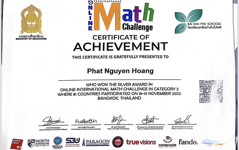 Giấy chứng nhận của đạt Huy Chương Bạc của Nguyễn Hoàng Phát