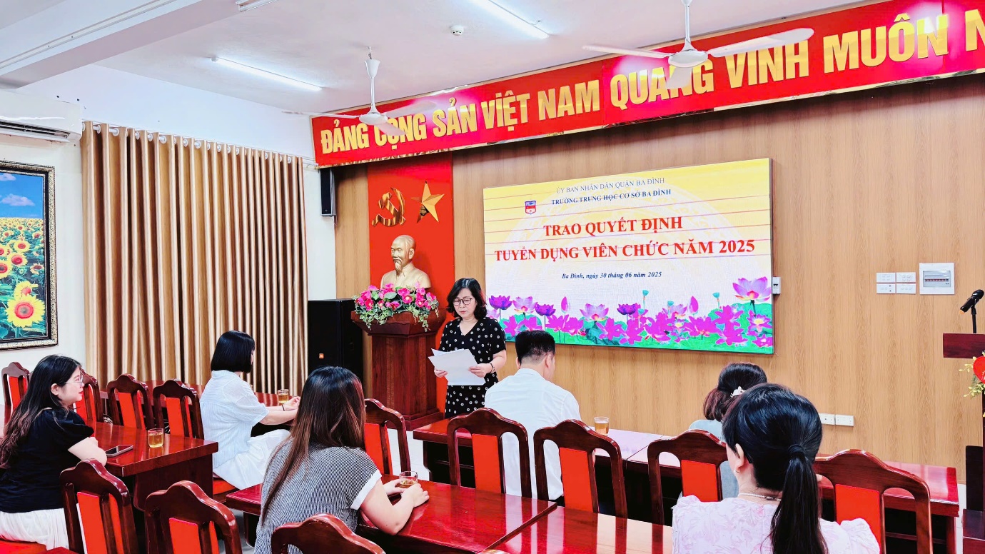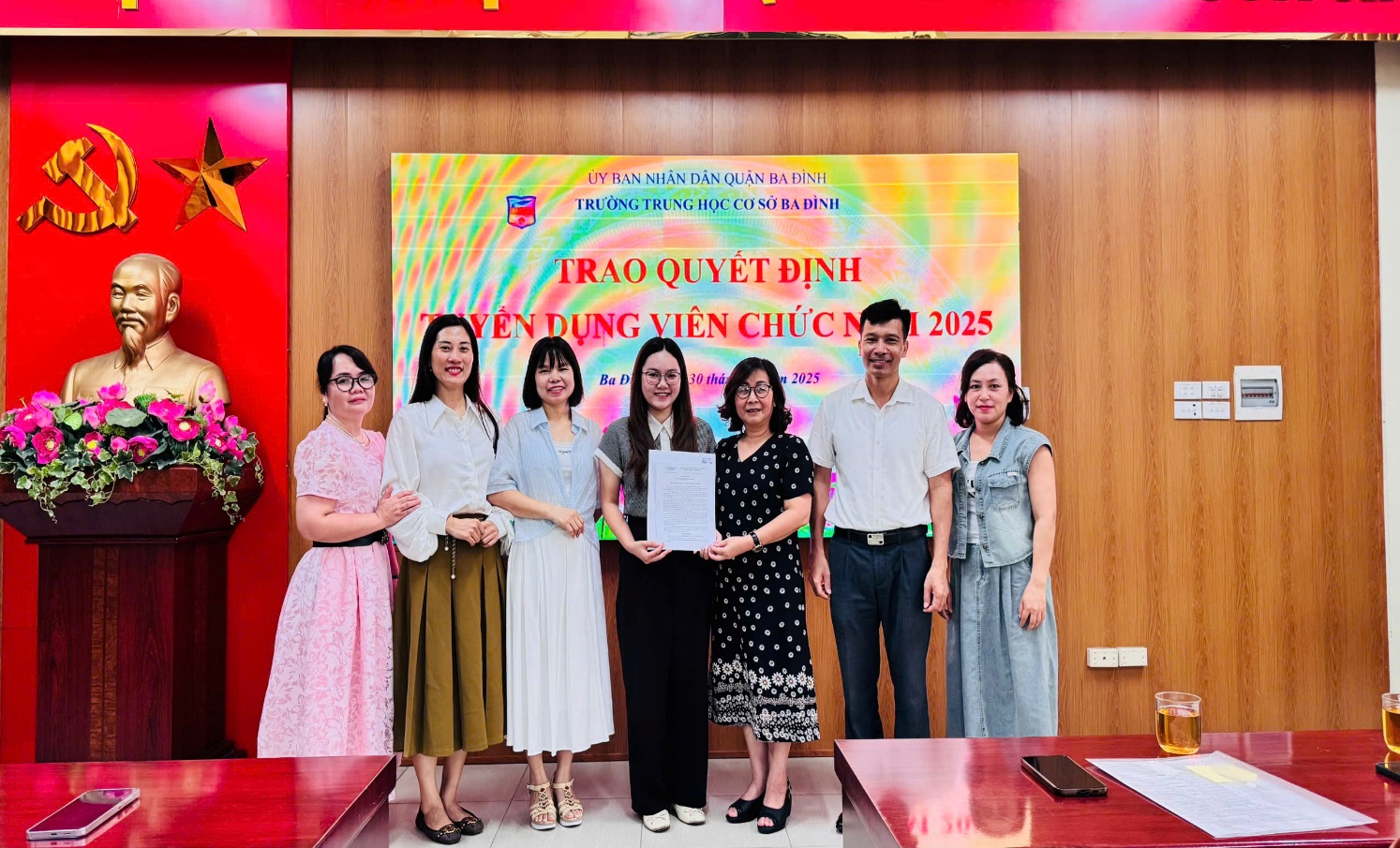 Thừa ủy quyền của UBND Quận Ba Đình, sáng ngày 30/6/2025, trường THCS Ba Đình tổ chức trao Quyết định trúng tuyển viên chức cho giáo viên mới về công tác tại trường.