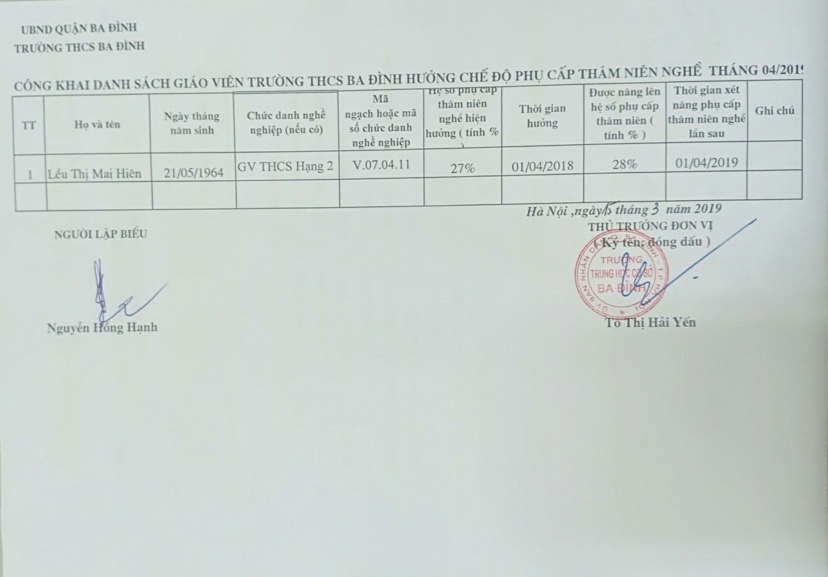 Công khai danh sách giáo viên trường THCS Ba Đình hưởng chế độ phụ cấp thâm niên nghề tháng 04/2019