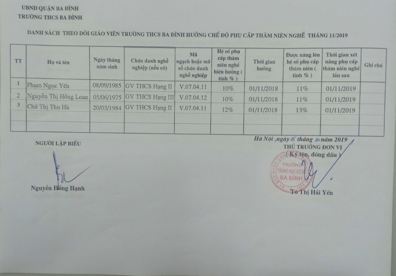 Công khai danh sách giáo viên trường THCS Ba Đình hưởng chế độ phụ cấp thâm niên nghề tháng 11/2019