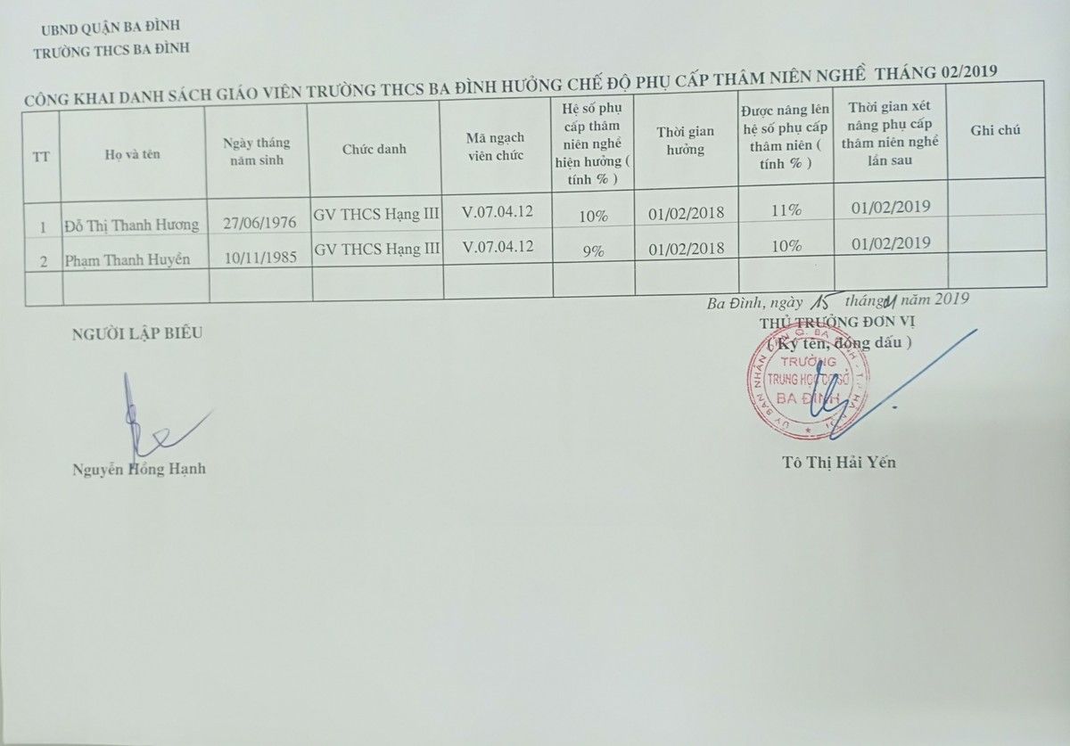 Công khai danh sách giáo viên trường THCS Ba Đình hưởng chế độ phụ cấp thâm niên nghề tháng 02/2019