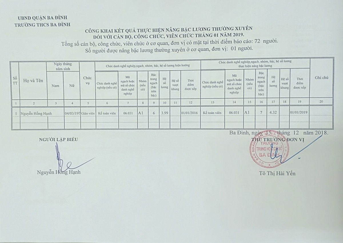 Công khai kết quả thực hiện nâng bậc lương thường xuyên đối với CB, CC, VC tháng 01/2019