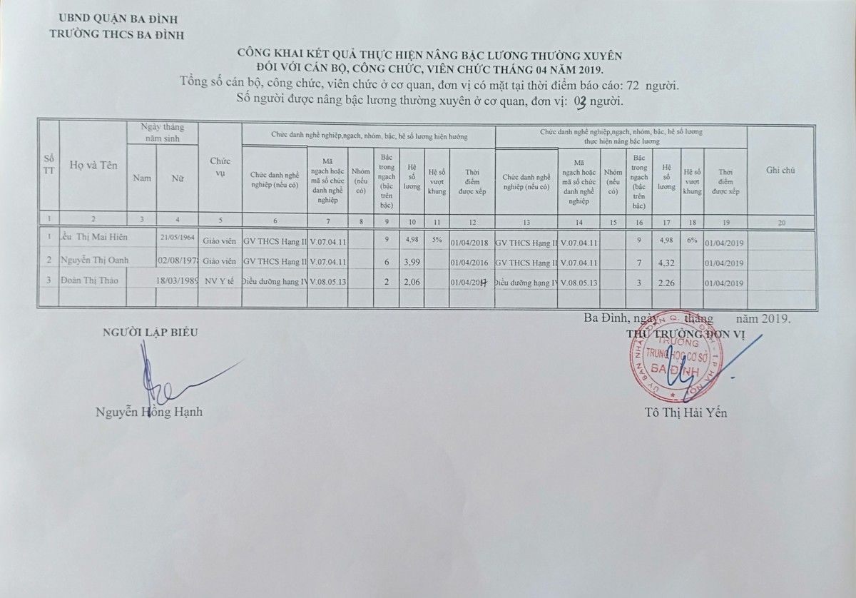 Công khai kết quả thực hiện nâng bậc lương thường xuyên đối với CB, CC, VC tháng 04/2019