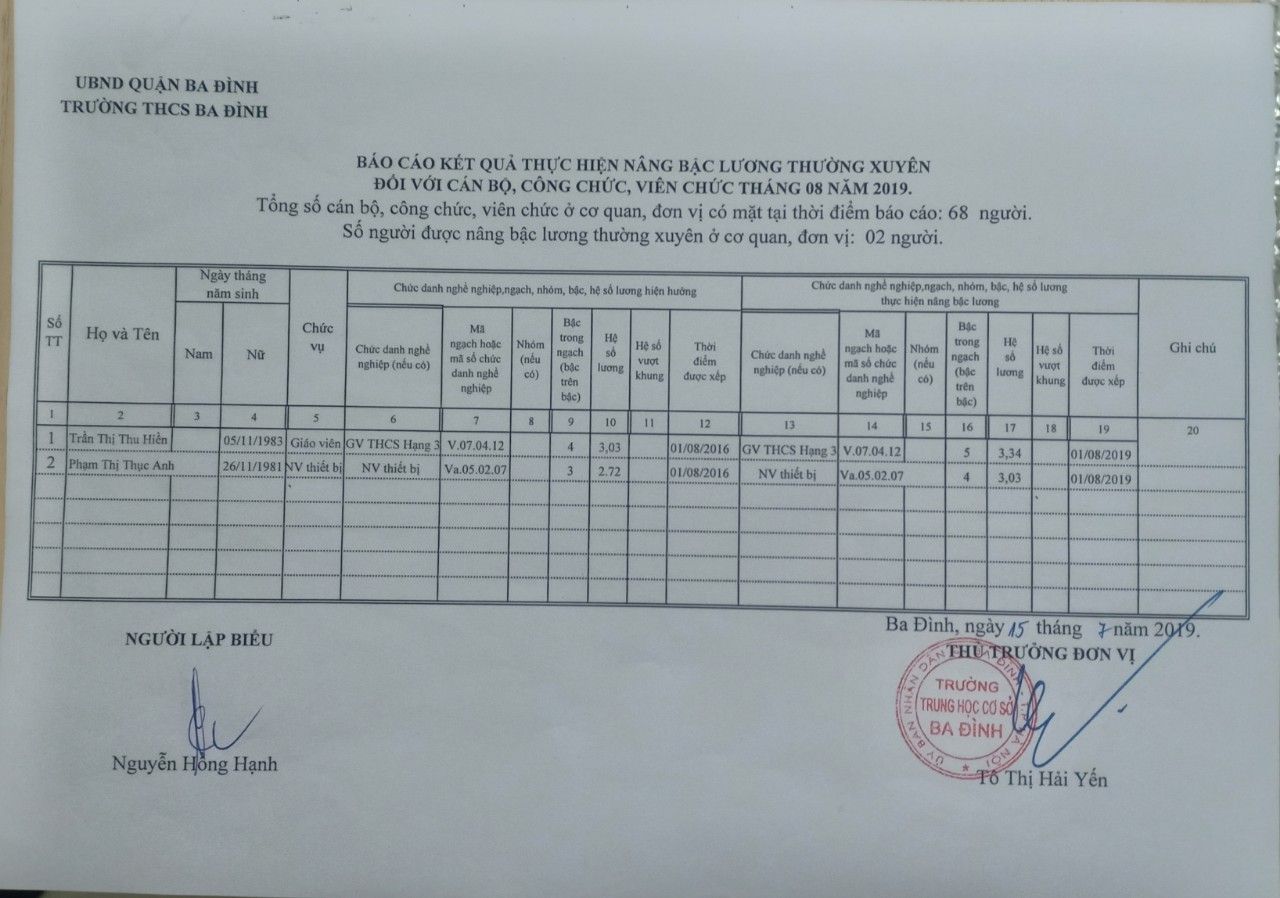 Công khai kết quả thực hiện nâng bậc lương thường xuyên đối với CB, CC, VC tháng 08/2019