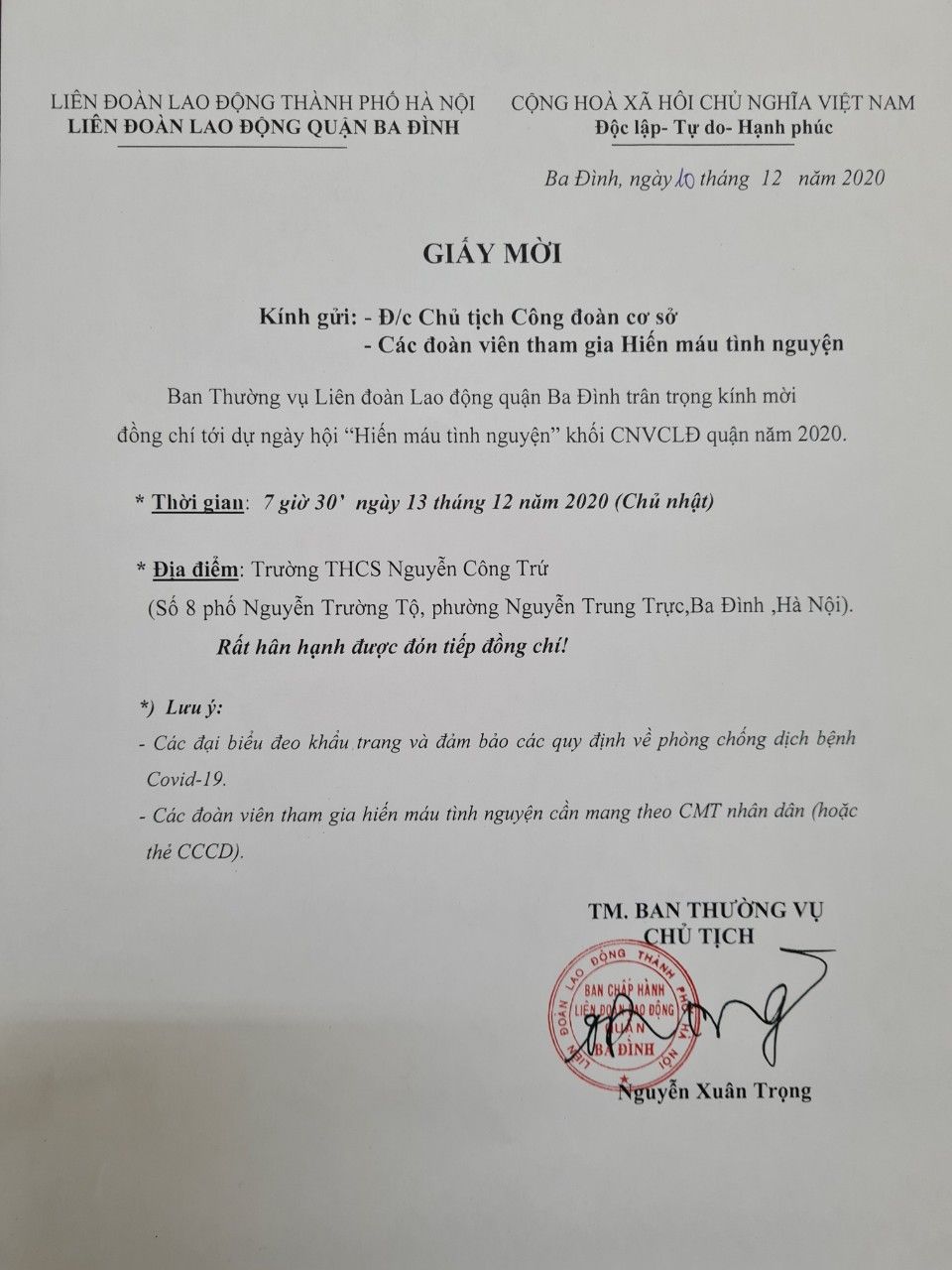 | Cơ quan ban hành | Liên đoàn Lao động quận Ba Đình | Ngày có hiệu lực | 10/12/2020 |