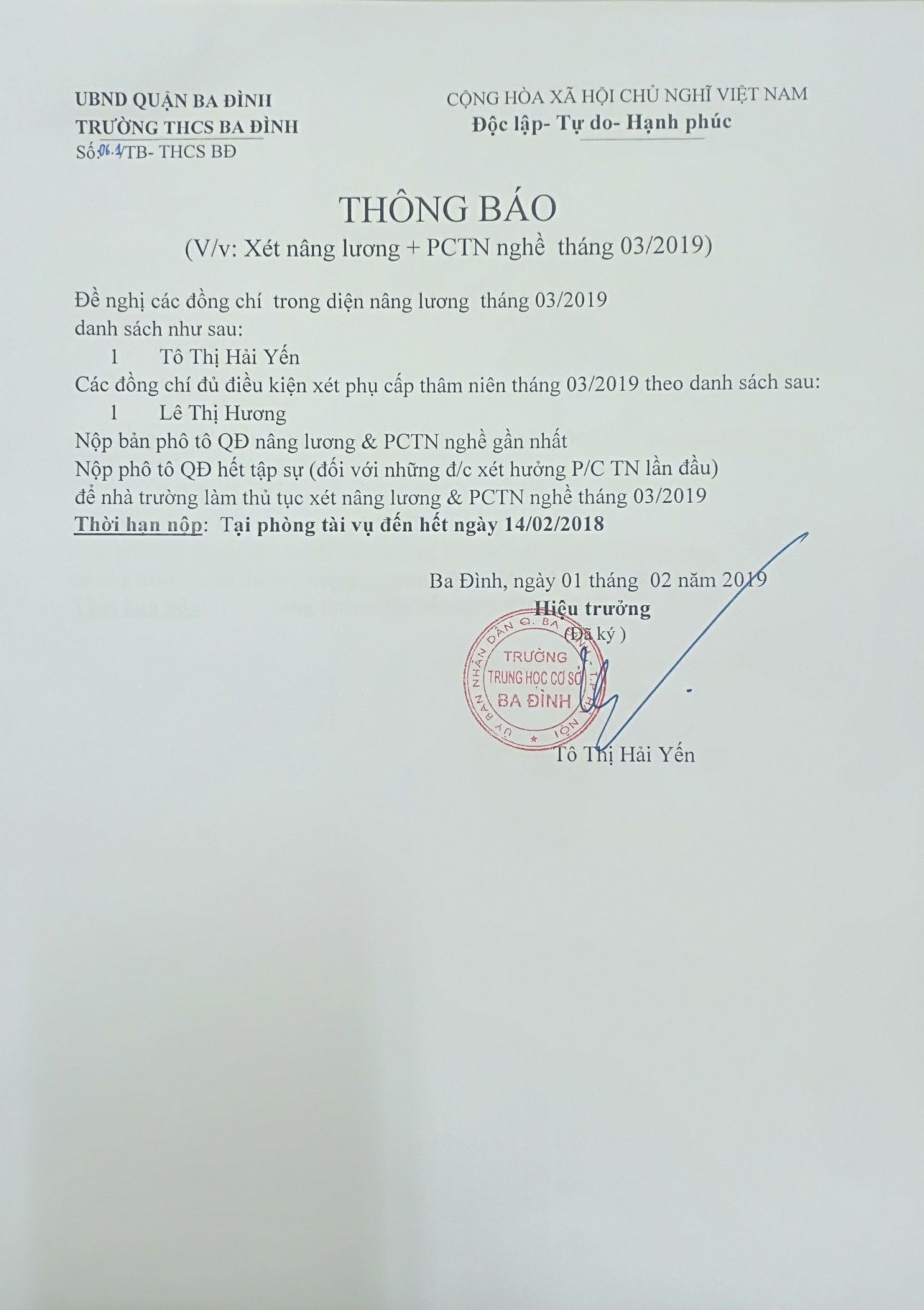 Thông báo về việc xét nâng lương và phụ cấp thâm niên nghề tháng 03/2019