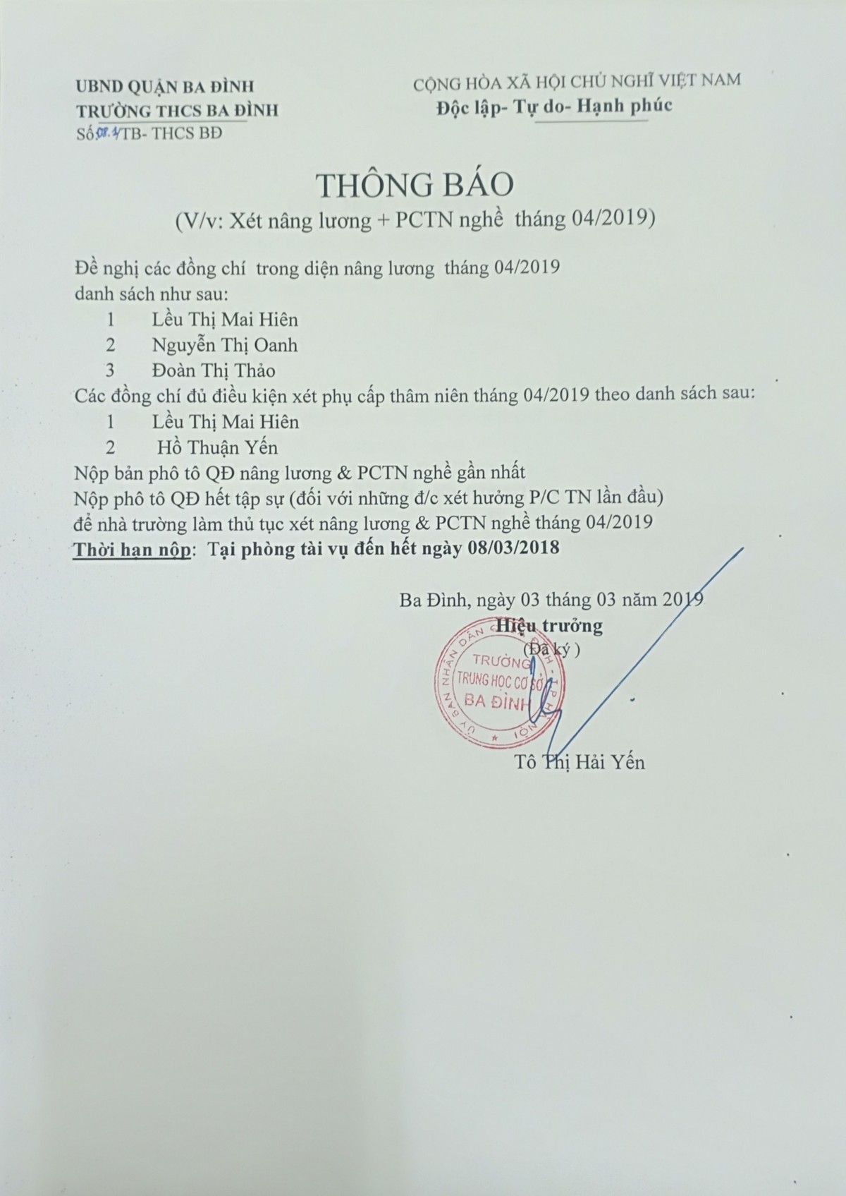 Thông báo về việc xét nâng lương và phụ cấp thâm niên nghề tháng 04/2019