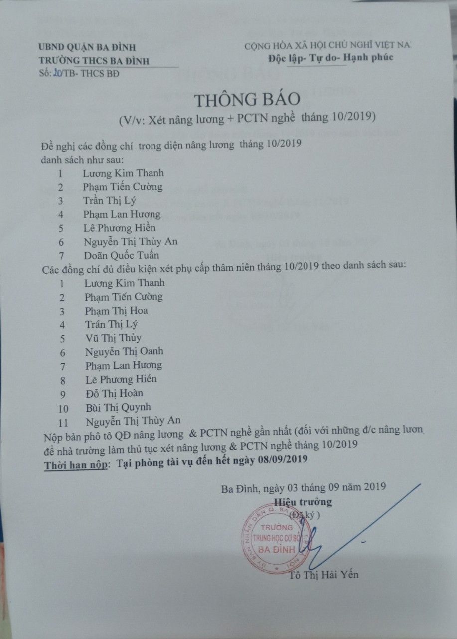 Thông báo về việc xét nâng lương và phụ cấp thâm niên nghề tháng 10/2019