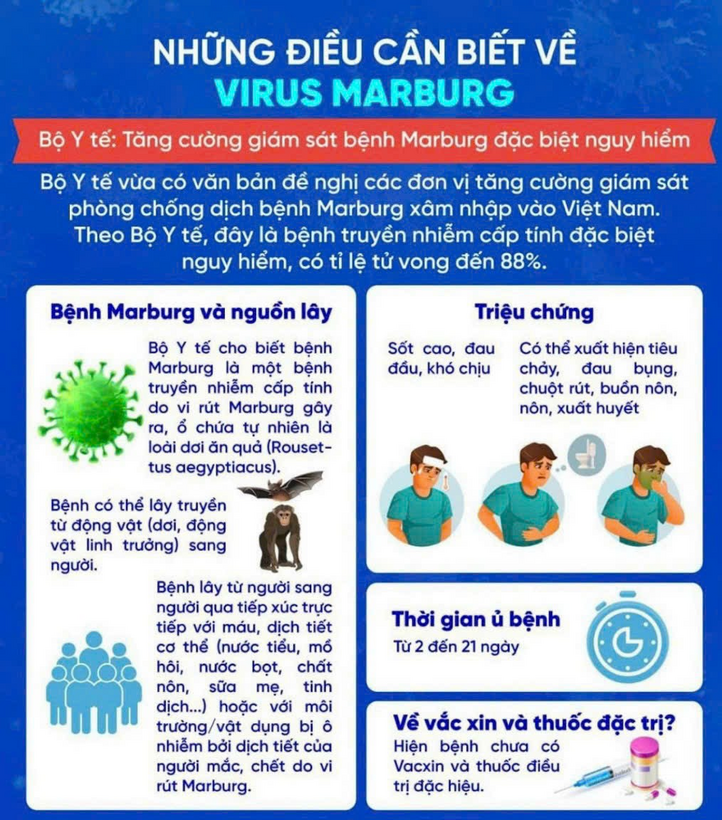 Virus Marburg được đánh giá là một trong những virus nguy hiểm thế giới. Theo các chuyên gia y tế, sau thời gian ủ bệnh trung bình từ 2 đến 21 ngày, các triệu chứng khởi phát đột ngột, tùy thuộc vào lượng virus lây nhiễm và con đường lây nhiễm. Đặc biệt, virus Marburg không lây nhiễm trong thời gian ủ bệnh.