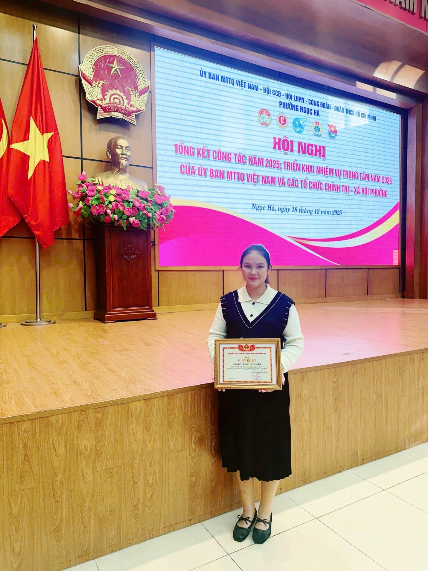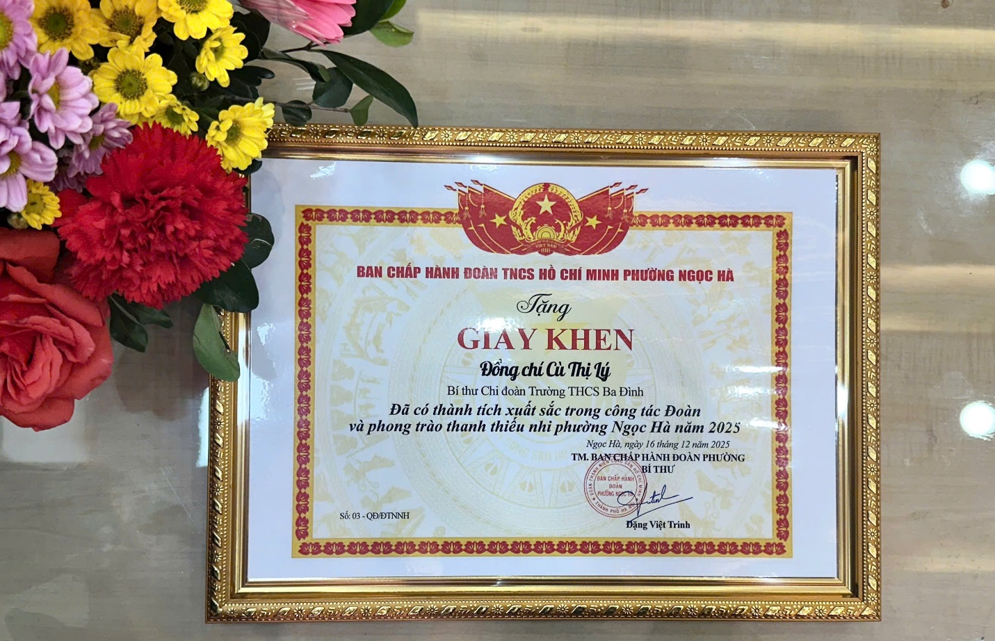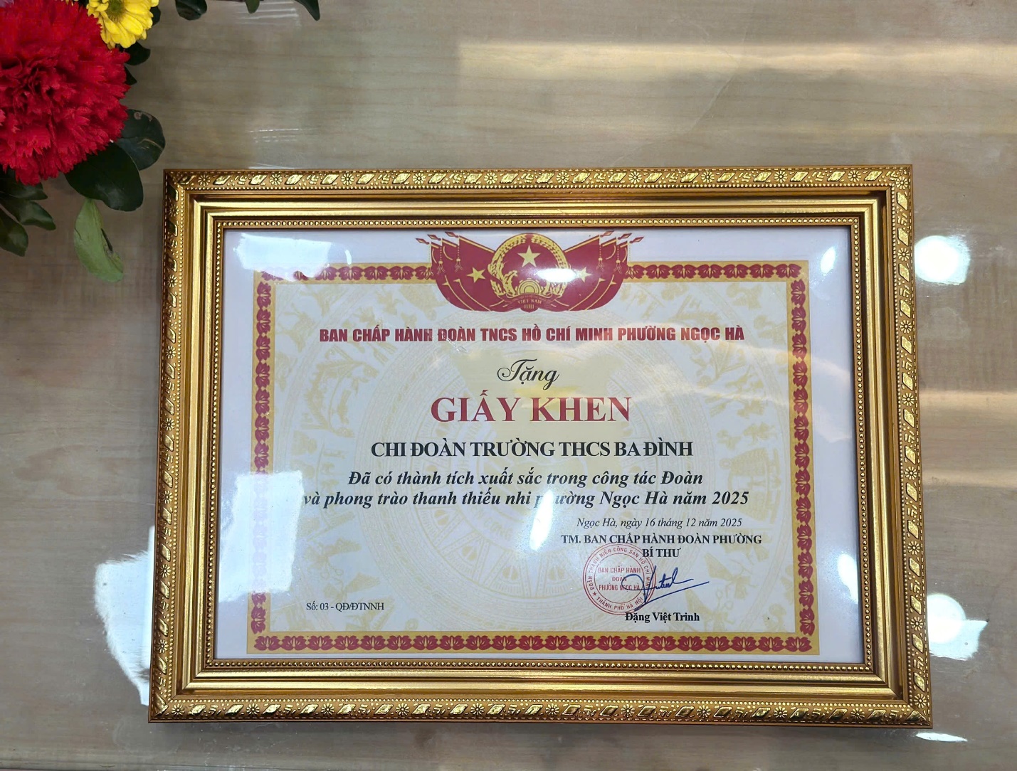 Trong năm học vừa qua, dưới sự quan tâm, chỉ đạo sát sao của Ban Giám hiệu nhà trường, Chi đoàn trường THCS Ba Đình đã tích cực triển khai hiệu quả nhiều hoạt động phong trào, hoàn thành tốt các nhiệm vụ được giao. Với những nỗ lực đó, Chi đoàn trường THCS Ba Đình vinh dự được Ban Chấp hành Đoàn phường Ngọc Hà trao tặng Giấy khen “Chi đoàn có thành tích xuất sắc trong công tác Đoàn và phong trào thanh thiếu nhi phường Ngọc Hà năm 2025”.