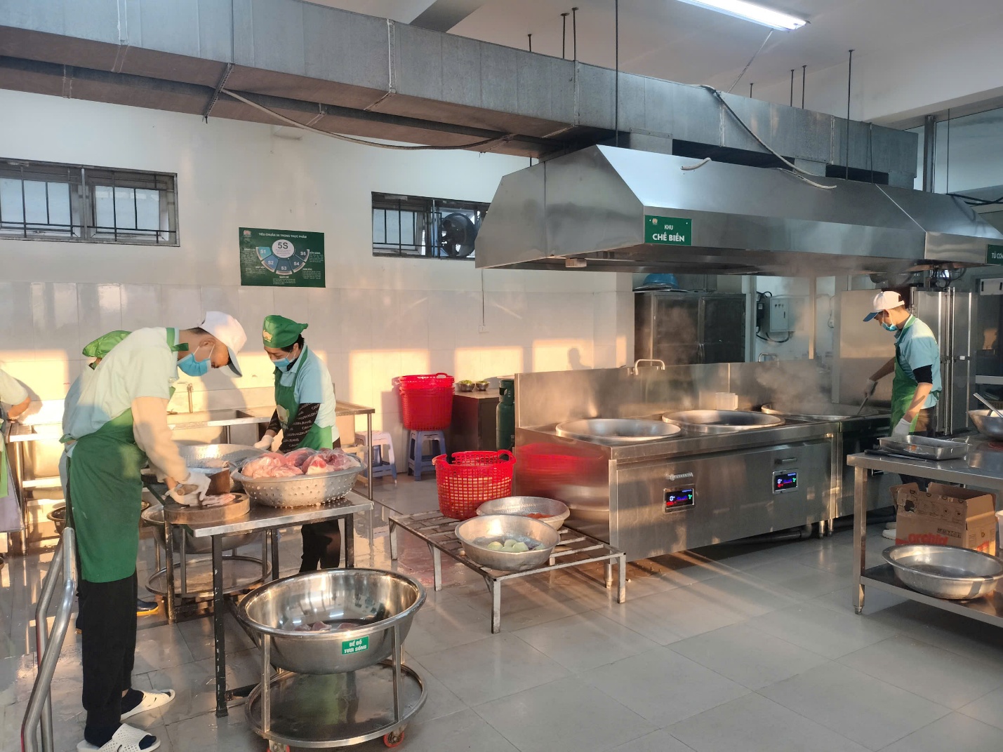 Với số lượng học sinh ăn bán trú đông, công tác Vệ sinh an toàn thực phẩm (VSATTP) được nhà trường coi là nhiệm vụ sống còn. Quy trình “một chiều” từ khâu tiếp nhận nguyên liệu đến chế biến và chia suất ăn được giám sát chặt chẽ.